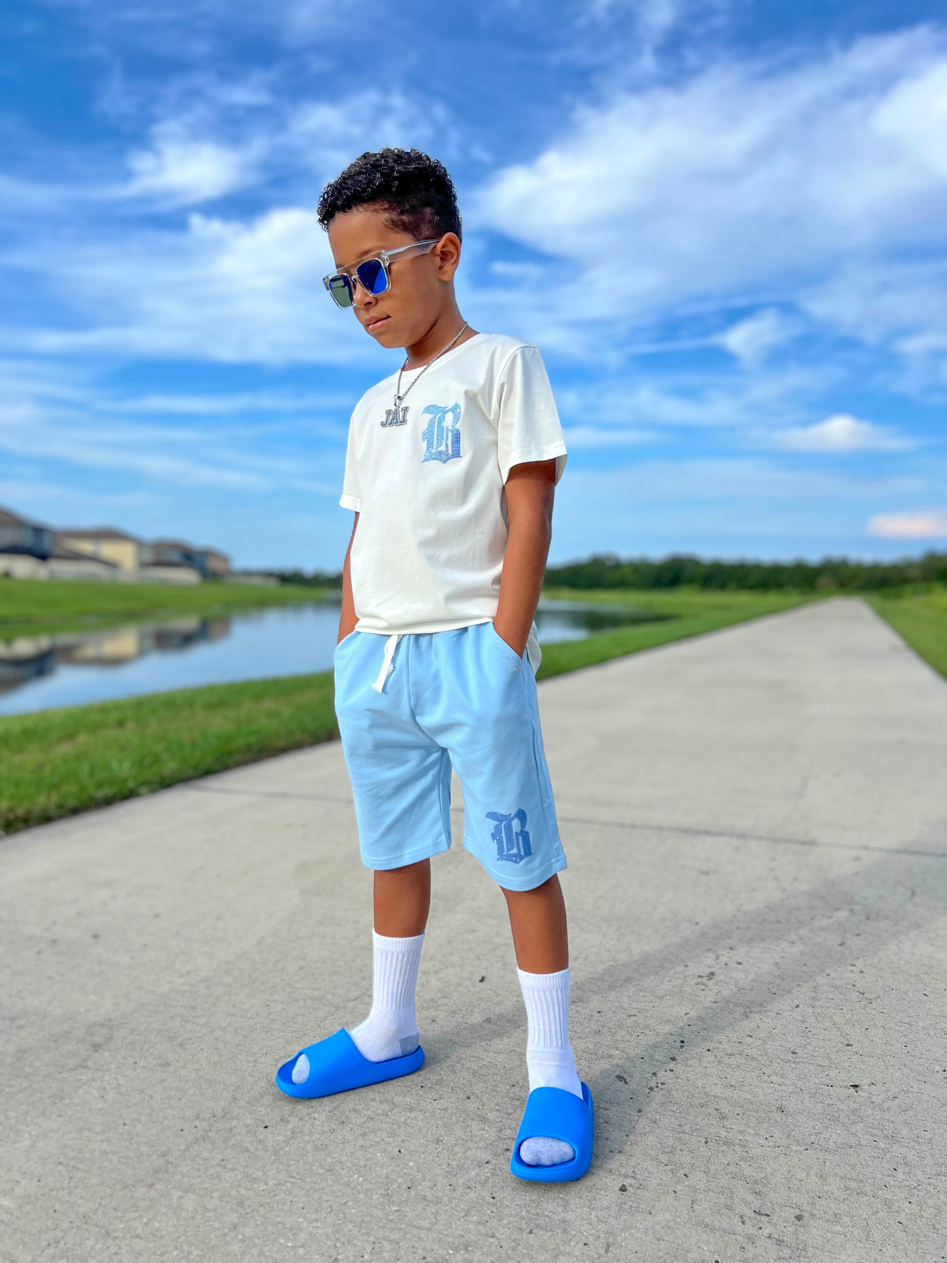 Kids Black Label Light Blue Bling Crew Neck T-Shirt and Cotton Shorts Set