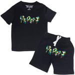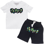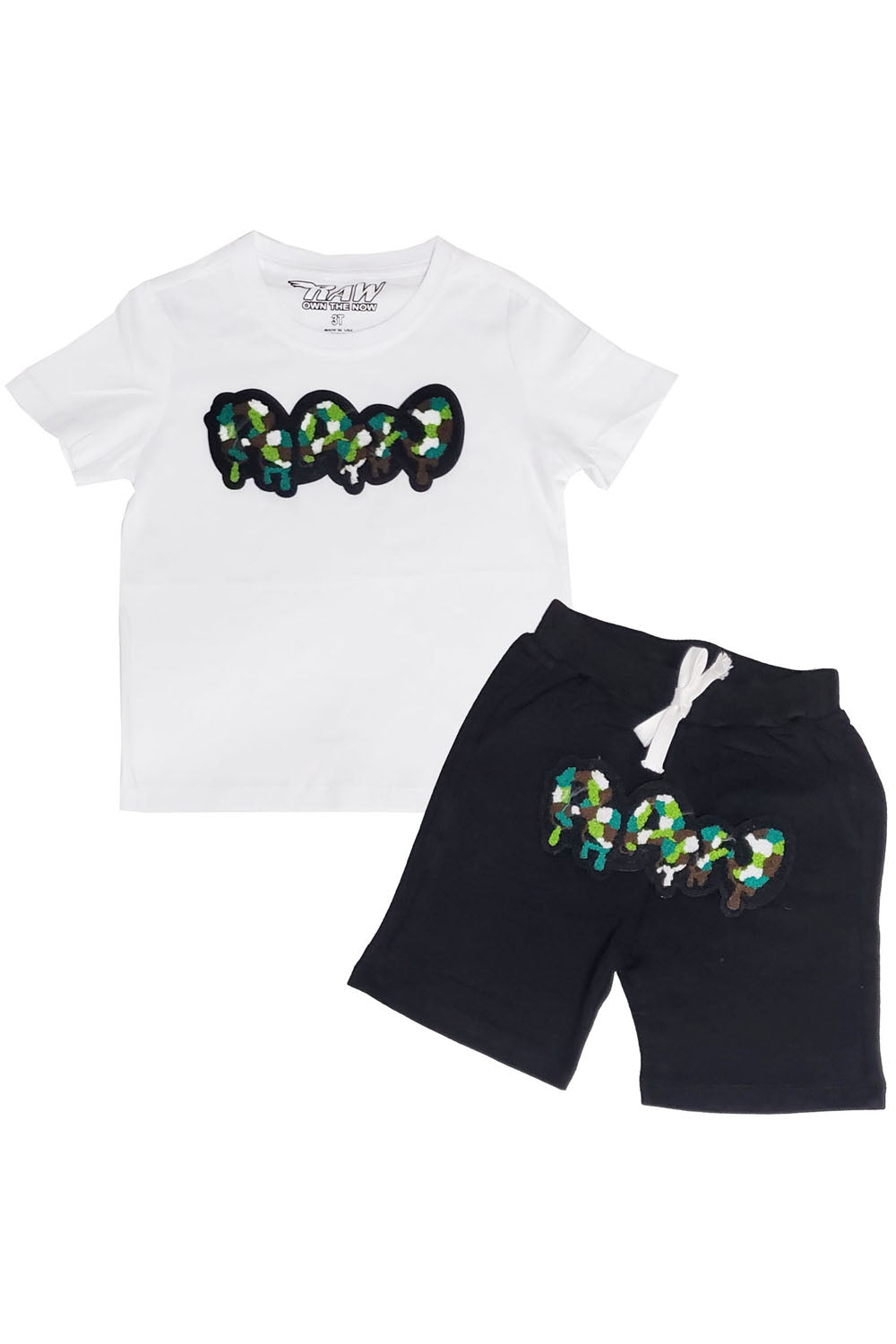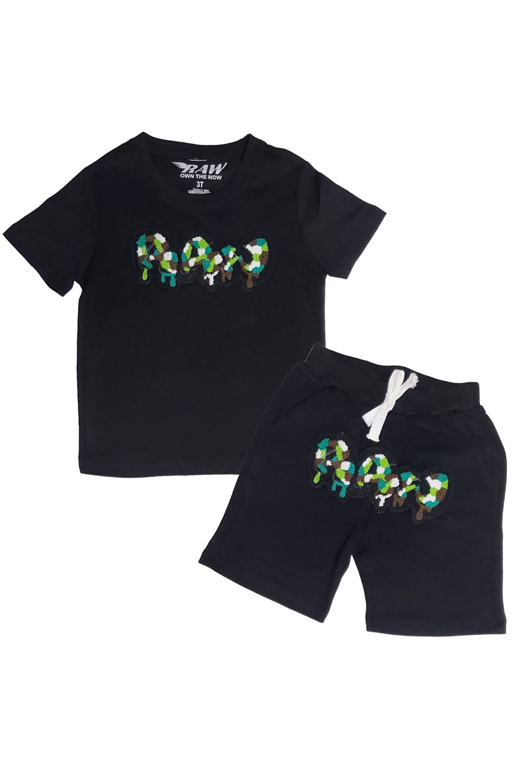 Kids RAW Drip Camo Green Chenille Crew Neck T-Shirt and Cotton Shorts Set