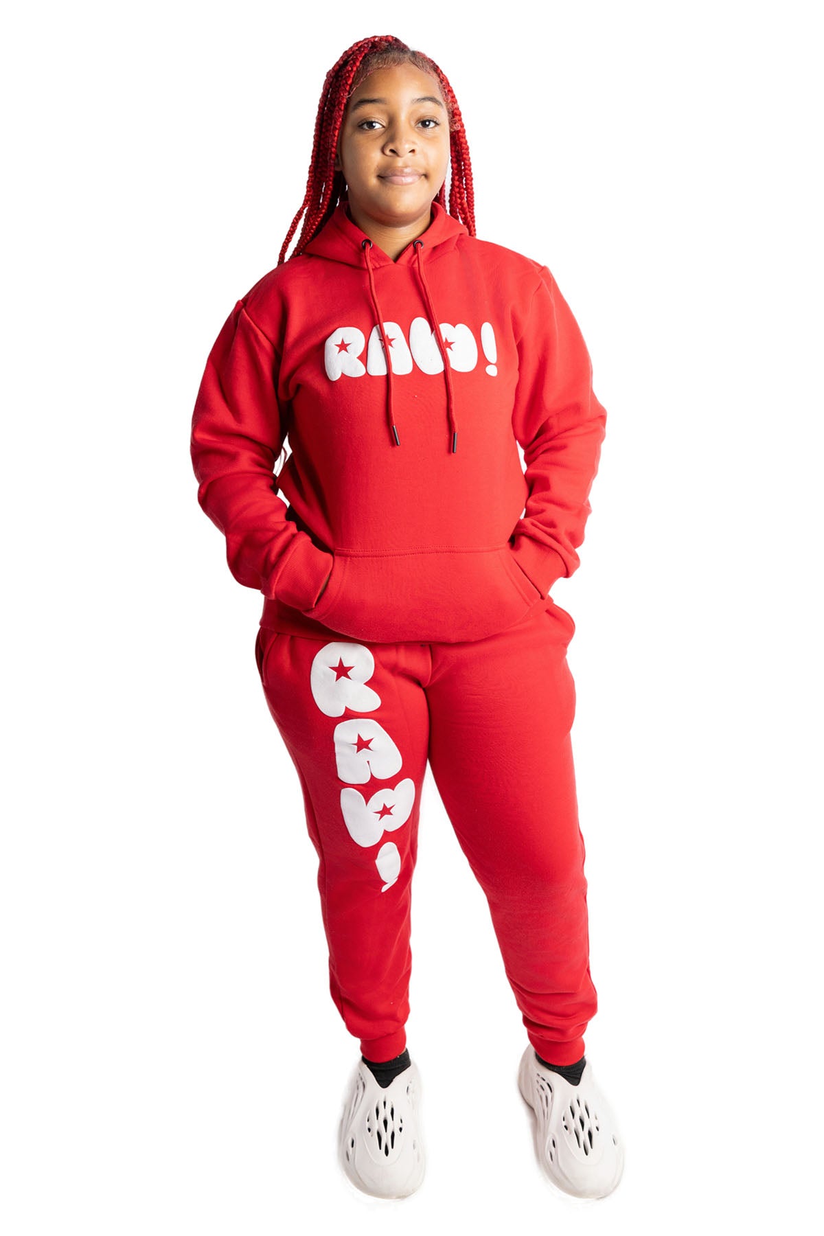 Rawyalty hoodie and jogger set with original graphic artwork on front.