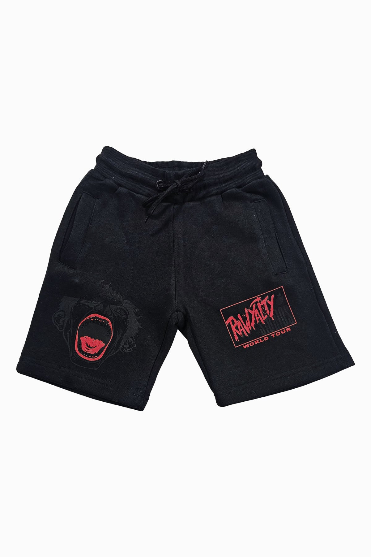 Rawyalty shorts with original graphic artwork on front.