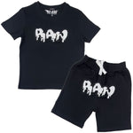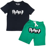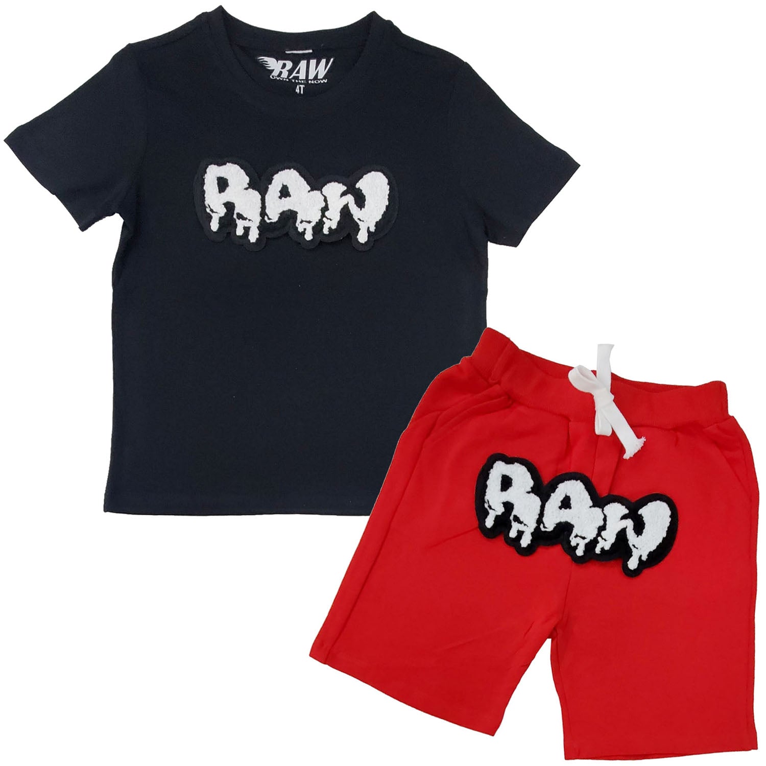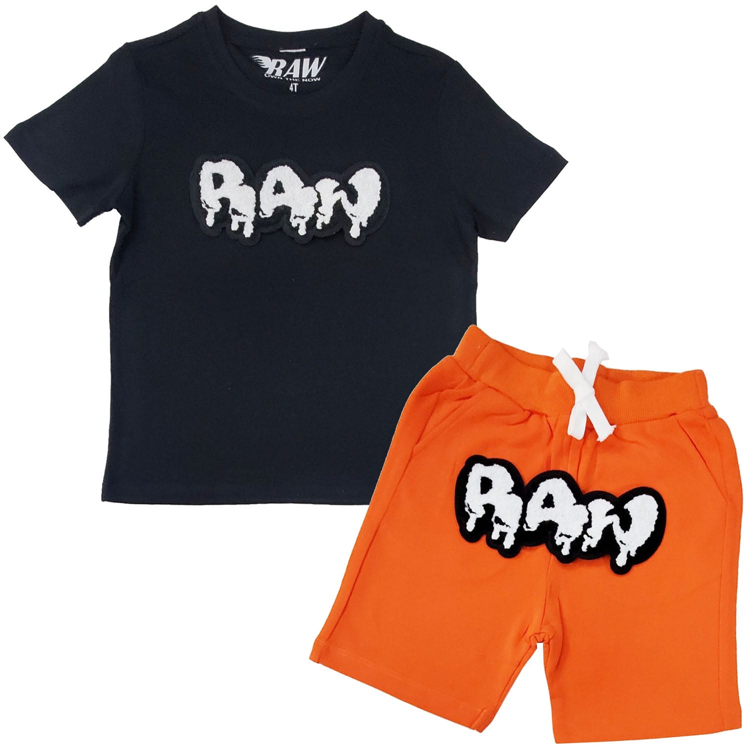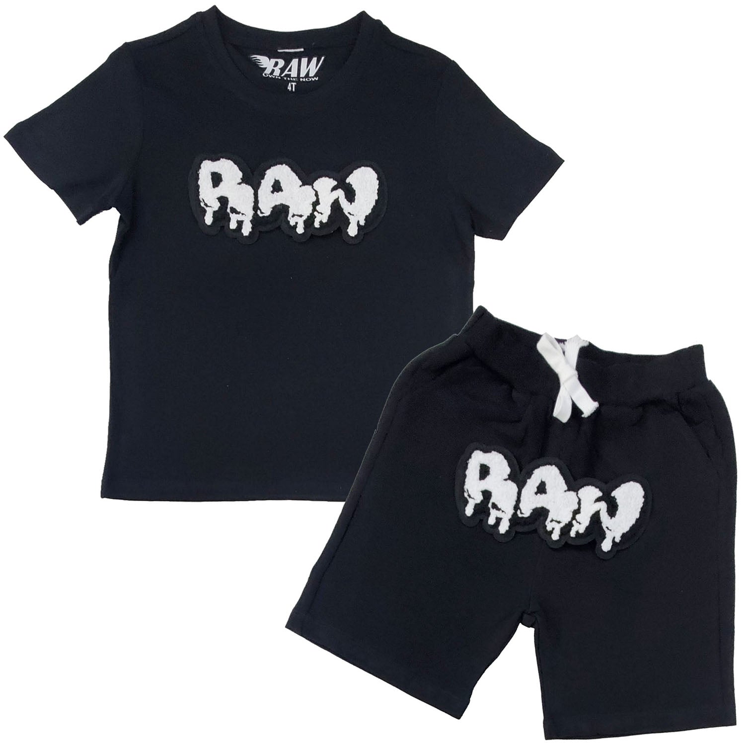 Kids RAW Drip White Chenille Crew Neck and Cotton Shorts Set - Black Tees / Yellow Shorts - Rawyalty Clothing